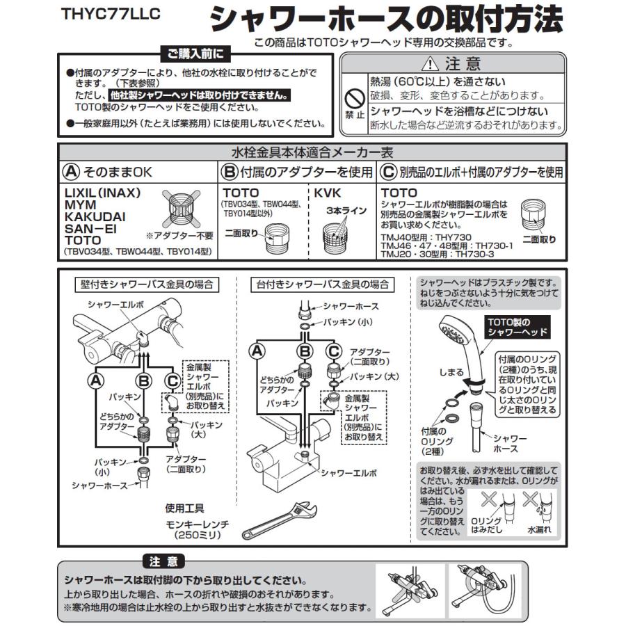 シャワー取り付けアダプター-取り付け方法 1 シャワーヘッドの連結部分を回して分離します。 2 分離された位置にH1シャワーフィルターを取り付けます。 3 連結部分から水漏れしないように固く締めます。 1 水柱の下端のシャワーホースの連結ネジを緩めて分離します。 (場合によってモンキースパナが必要です) 2シャワーアダプター | メーカー別適合表 シャワーアダプターは、SANEI のホースが他社の混合栓に直接付かない場合に必要なアダプターです。 品番:PT25 水栓:TOTO社製小口 品番:PT252 水栓:TOTO社製大口 品番:PT2511 水栓:TOTO社製 品番:PT253